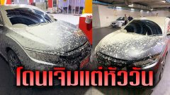 เก๋งป้ายแดง สุดช้ำเจอน้ำปูนหล่นใส่ สภาพเละทั้งคัน