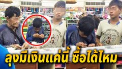 พ่อชรายืนนับเงินเหรียญซื้อของให้ลูก
