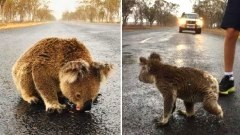 โคอาล่าออกมาดื่มน้ำฝนกลางถนนหลังเกิดไฟป่า ถึงดูน่ารักแต่ก็อันตรายไม่น้อย