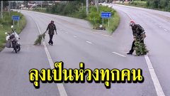 ลุงจอดรถข้างทาง ถือกิ่งไม้กวาดเศษแก้วออกจาถนน