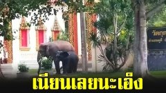พระ เณร กระเจิง ช้างป่าบุกเข้าวัด ตีเนียนยืนนิ่งคู่รูปปั้นช้าง