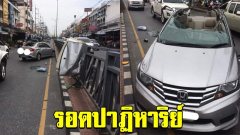 สาวขับเก๋งหลบกระบะ เสียหลักชนหลังคาเปิดทั้งแถบ รอดปาฏิหาริย์
