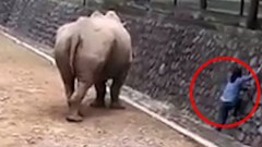 บ้าบิ่นเกินไป!! หญิงเม็กซิโกปีนลงไปในกรงแรดตัวยักษ์ เพื่อเก็บโทรศัพท์ที่ทำร่วง โชคดีหนีรอดมาได้ (มีคลิป)