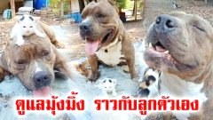 พิทบูลเลี้ยงลูกแมวถูกทิ้งวัดนับสิบ ดูแลมุ้งมิ้งราวกับลูกแท้ๆของตัวเอง
