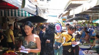 กะเทยครองตลาดมหาชัย “พรรคไทรักธรรม“ เดินหาเสียง หน้ากากอีกาดำ - ทุเรียนก็มา