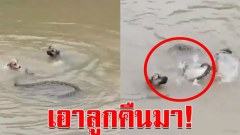 เอาลูกคืนมา ศึกระหว่างงูเหลือมตัวใหญ่ กับ เจ้าตูบสองตัว สู้ในน้ำอย่างดุเดือด