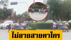 สุดอึ้ง!! ฝรั่งโชว์อนาคอนดา ยืนฉี่ท้ายรถสองแกว ทีมงานหาเสียงตาค้าง