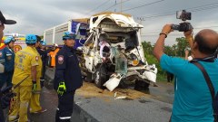 สิบแปดล้อชนท้ายสิบแปดล้อมีผู้เสียชีวิตติดในรถต้องตัดถ่างออกมา