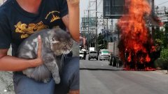 หนุ่มขับพ่วง 18 ล้อ อุ้มแมวเพื่อนรัก โดดหนีไฟลุกไหม้ เอาชีวิตรอดหวุดหวิด