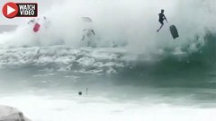 ช่วงเวลาสุดน่ากลัว..เมื่อคลื่นยักษ์โถมเข้าใส่กลุ่มนักโต้คลื่น ก่อนปะทะโขดหินขนาดใหญ่ (มีคลิป)