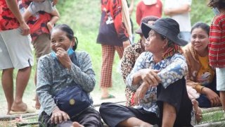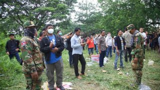 ป้ากัมพูชาหอบกะละมังกระเทียมบุกแนวรั้วชายแดน! อ้างป้องกันสารเคมีจากทหารไทย