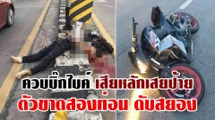 สยองอีก หนุ่มควบบิ๊กไบค์คู่ใจชนป้ายจราจร ตัวขาดสองท่อน