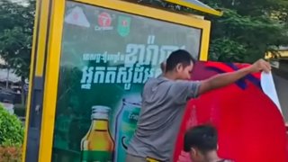 ชาวเขมรปิดป้ายที่มีสปอนเซอร์เสียม