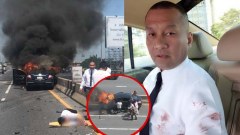 ชนสนั่นไฟลุกท่วม กลางด่วนคู่ขนานลอยฟ้า “ร้อยตำรวจเอก” ทุบกระจกช่วยชีวิต