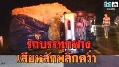 รถบรรทุกฟาง เสียหลักพลิกคว่ำ