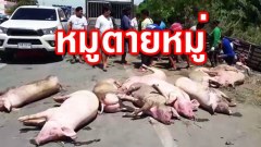 รถบบรรทุกหมู 90 ตัว เสยรถจิ๊ป อส.เมืองนครปฐมตกคูน้ำ ดับคาซากรถ