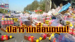 กระบะบรรทุกปลาร้ายางระเบิดเสียหลักพลิกคว่ำกระจายเกลื่อนถนน