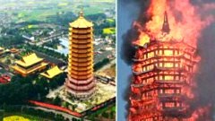 ภาพล่าสุด ไฟไหม้เจดีย์ดังของจีนจนราบ
