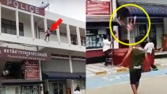วินาทีร่วง!! สาวใหญ่คลั่งปีนตึก สน.ประโคนชัย (ชมคลิป)