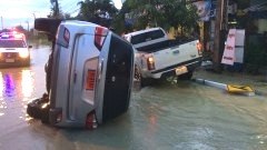 น้ำล้นถนน คนขับรถพยายามหักหลบกระแสน้ำ เสียหลักชนกัน