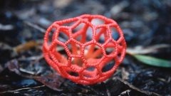 เห็ดแปลก มีก้อนกลมเหมือนลูกตะกร้อสีแดงอมชมพู มีกลิ่นเหม็น