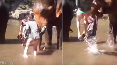 สื่อนอกเตือนภัยช้าง!! นักท่องเที่ยวสาวเข้าไปช่วยอาบน้ำ "ช้างไทย" ถูกช้างขวิดกระเด็น น่าสงสารมาก (มีคลิป)